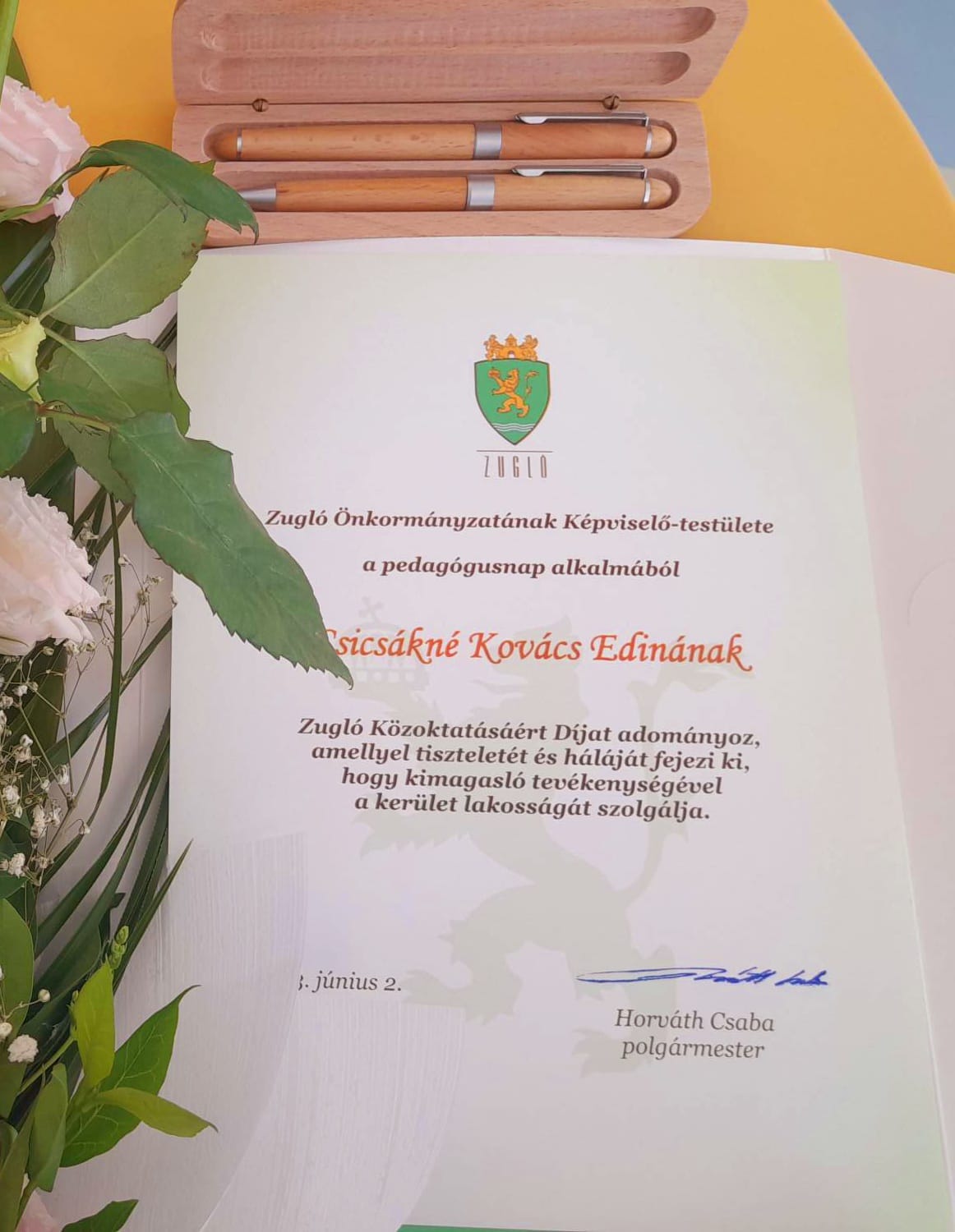 CSICSÁKNÉ KOVÁCS EDINA tanító, kiemelkedő oktató-nevelő tevékenységét „Zugló Közoktatásáért Díj”- jal jutalmazta ma Zugló Önkormányzata.